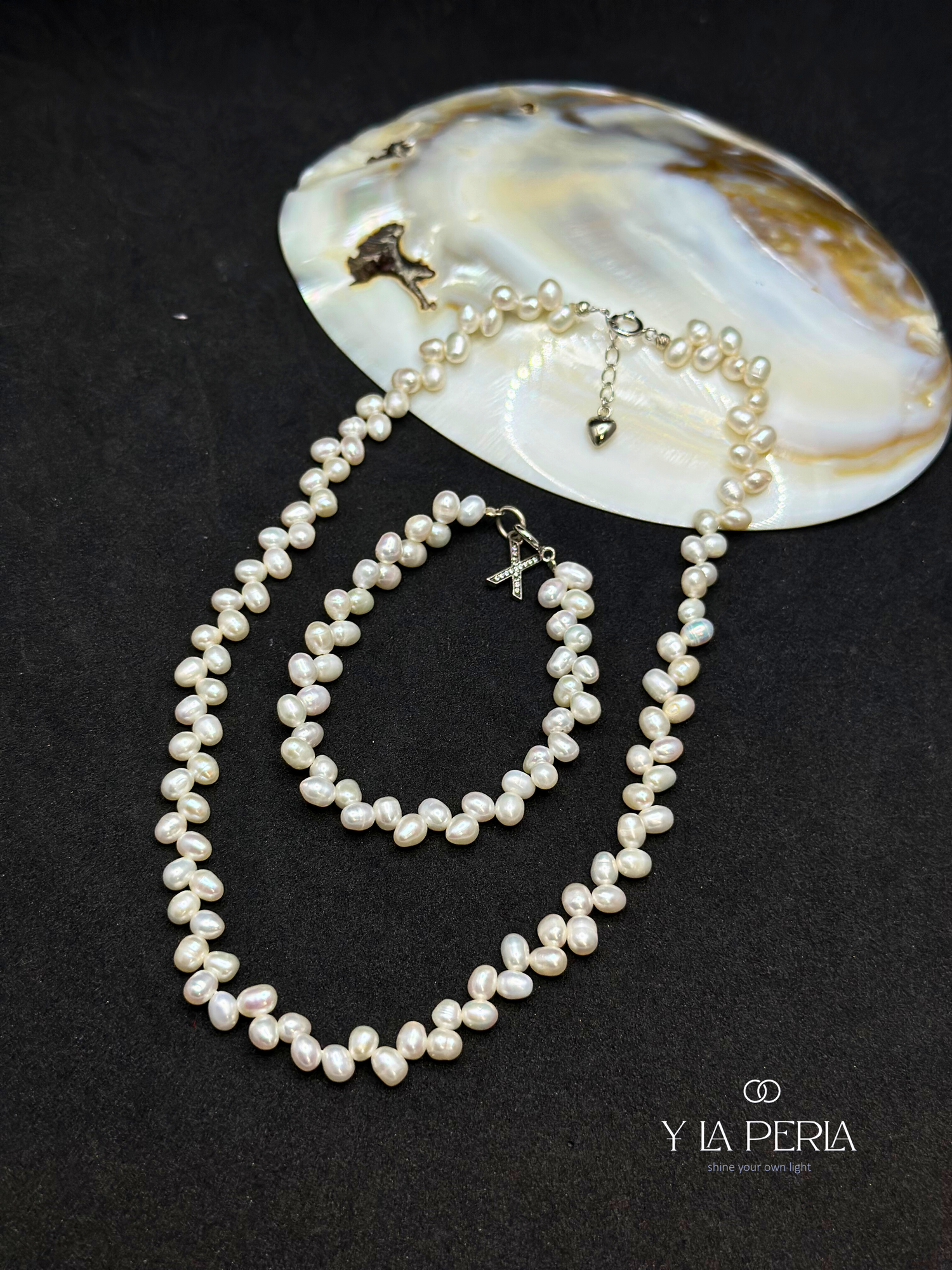 Gently wipe your pearls with a soft cloth after each wear. Avoid contact with perfumes, lotions, water, or harsh chemicals, as moisture may weaken the stringing. Always store them in our dedicated Y La Perla pouch to keep them safe and lustrous.